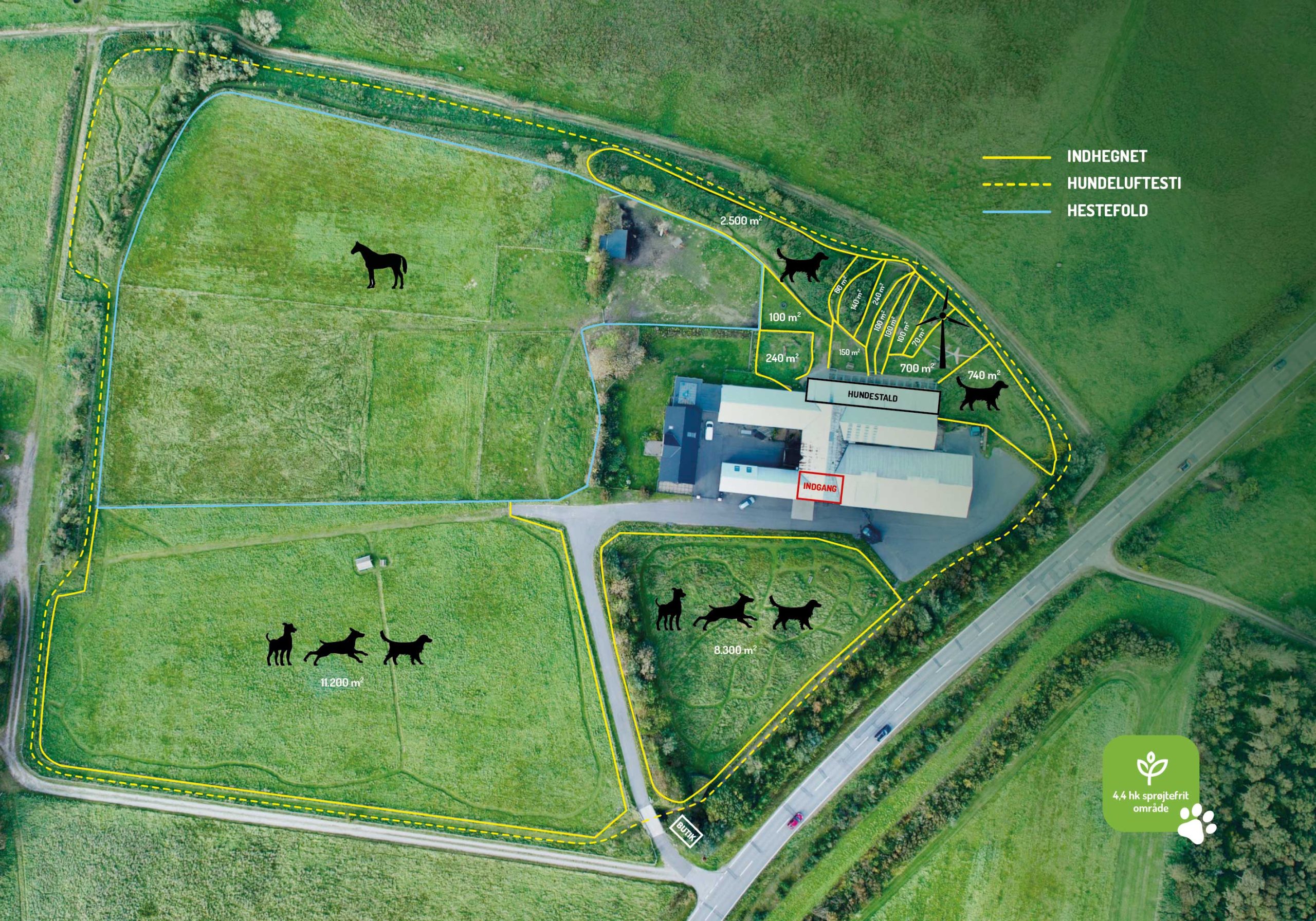 Vores 4,5 hektar store, indhegnede område rummer både en natursti på over 1 km, kuperet terræn, en lille skov og en tunnel, der giver masser af plads til leg, nysgerrighed og frihed.